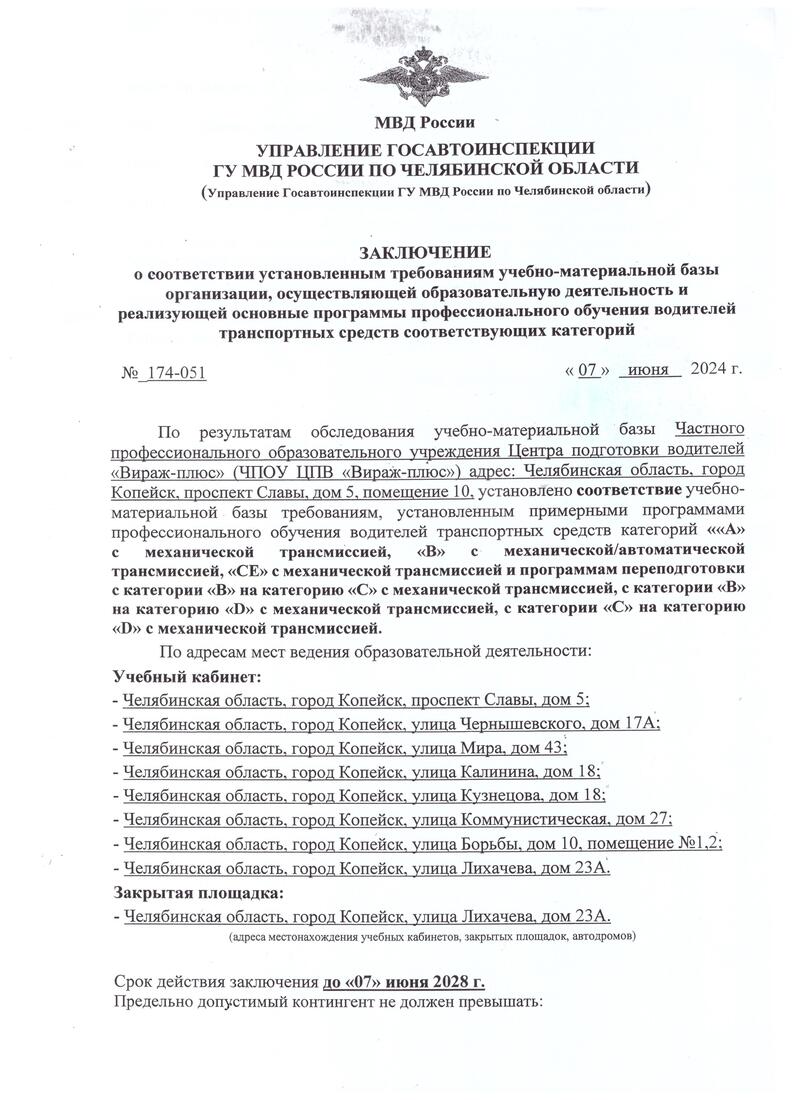 - Местонахождение образовательной организации: 456618, Челябинская область, г. Копейск, пр. Славы, д. 5 пом. 10; ЧПОУ ЦПВ «Вираж-плюс» филиалов не имеет.